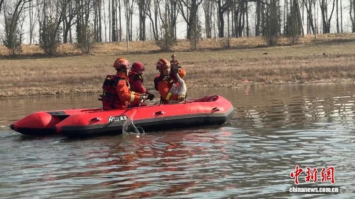 获救大天鹅均已移交当地林业部门。 梁鹏 摄前两只大天鹅的救援相对顺利。虽然大天鹅看到橡皮艇靠近都会转头“逃离”,而且在游动过程中频繁变向,但其均无飞行能力,相继被消防员捞起。