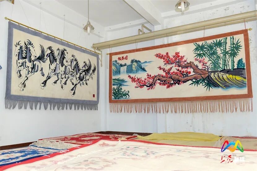 在云霖地毯的陈列室内,一幅幅手工地毯作品悬挂陈列,宛如一座流动的非遗艺术展。牡丹纹样的“富贵满堂”、奔马奔腾的昂扬姿态、长城蜿蜒的雄奇景观、梅竹相依的清雅意境…… 这些承载着传统文化寓意的题材,均由匠人纯手工织就,纹样清晰灵动,工艺细腻精巧,每一处细节都彰显着手工地毯独有的艺术格调与制作水准。“手工地毯的珍贵,藏在选材与工序的极致追求里。”公司负责人宋云康指着一幅长城主题地毯说道,“我们只用进口纯羊毛和优质棉纱线,羊毛纤维长、韧性足,织出的毯面才够柔软厚实,保暖又耐用。从最初的图案设计、丝线缠绕、织机上经、打底定型,到核心的编织环节,再到后续的平毯、洗毯、剪花、整修,整整十余道工序,一道都不能省,且全程靠手工完成。”